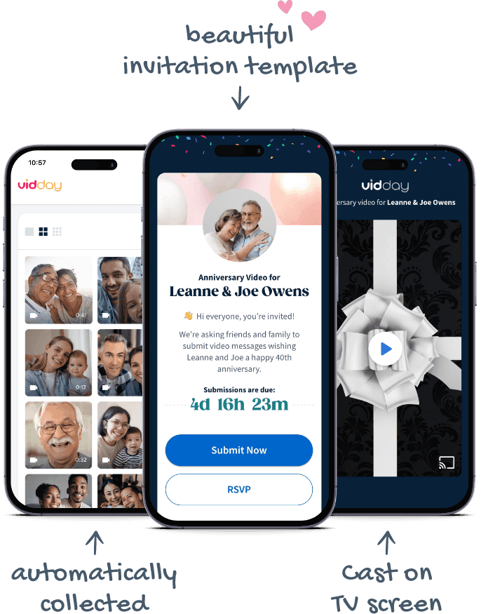 Give VidDay a TryEasily collect heartfelt messages from loved ones who couldn’t be there in person to celebrate the wedding anniversary. Whether it’s a parent, sibling, or close friend who lives far away, VidDay makes it easy to bring everyone together.