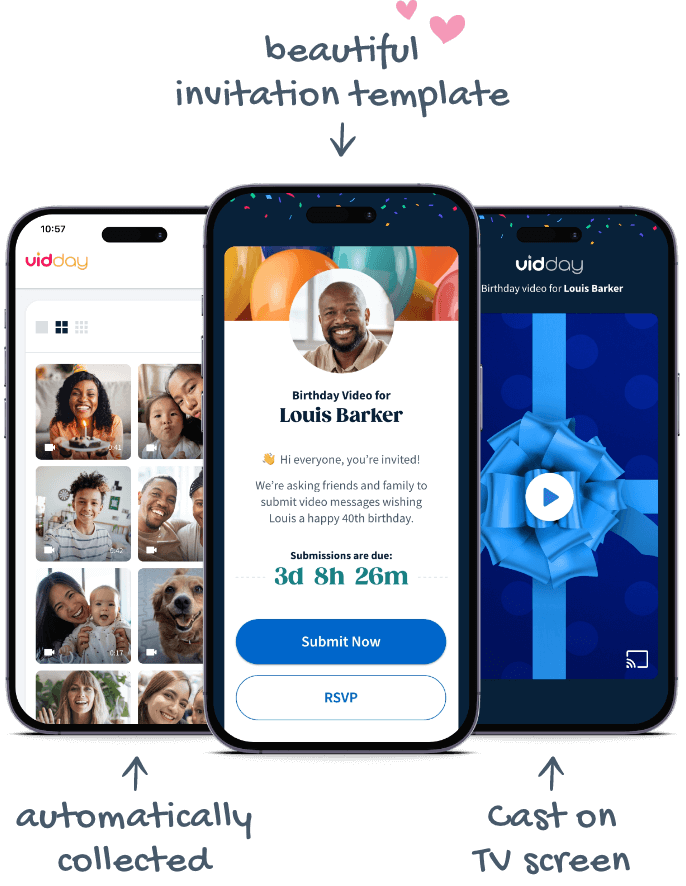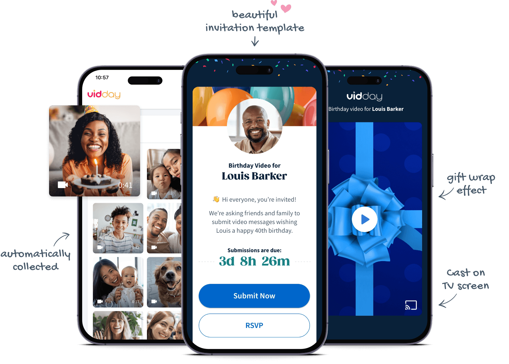 ¡Buena pregunta! Con el creador de videos de cumpleaños de VidDay, puedes reunir a seres queridos, amigos, familiares y colegas en un solo video sorpresa de cumpleaños. Todos pueden unirse a la celebración de cumpleaños ya sea desde la distancia o cerca. Puedes incluir los deseos de cumpleaños de todos y recopilar fotos para hacer un montaje de video inolvidable. Además, el video de cumpleaños es un recuerdo descargable para el afortunado destinatario. Podrán ver el video una y otra vez — recuerdos para toda la vida.